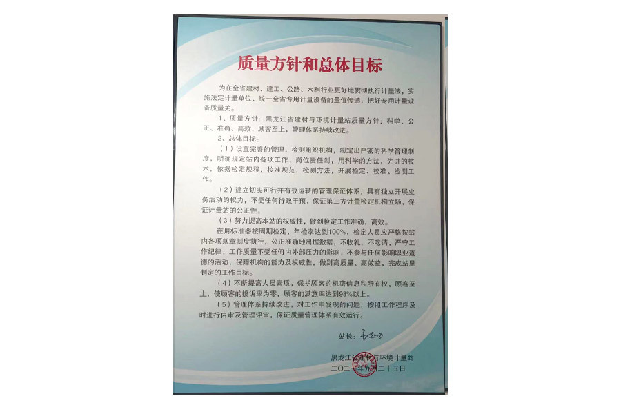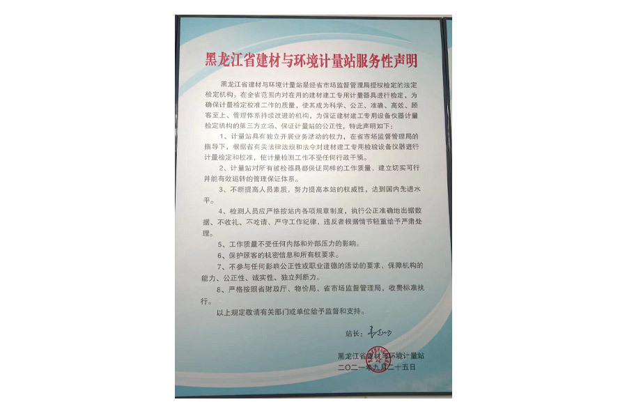 黑龍江省建材與環(huán)境計量站,位于哈爾濱市南崗區(qū)西大直街370號,隸屬于黑龍江省建材工業(yè)規(guī)劃設計研究院,計量檢定工作任務和業(yè)務受省市場監(jiān)督管理局領導。1991年2月5日經(jīng)黑龍江省市場監(jiān)督管理局建標授權,正式建站,建站批文為黑技監(jiān)工[1991]31號文件,建站名稱為黑龍江省建材計量站,2018年11月5日經(jīng)黑龍江省市場監(jiān)督管理局批準,更名為“黑龍江省建材與環(huán)境計量站”,批復文件:黑質技監(jiān)函發(fā)【2018】246號。